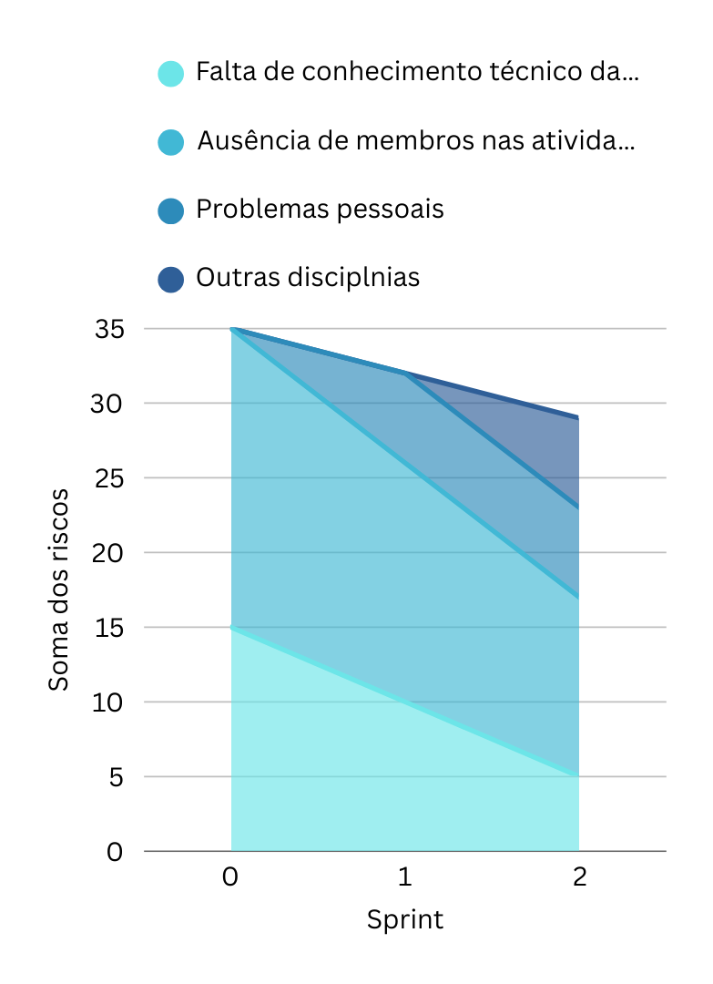 - A soma total dos riscos diminui ao longo do tempo, do Sprint 0 ao Sprint 2.