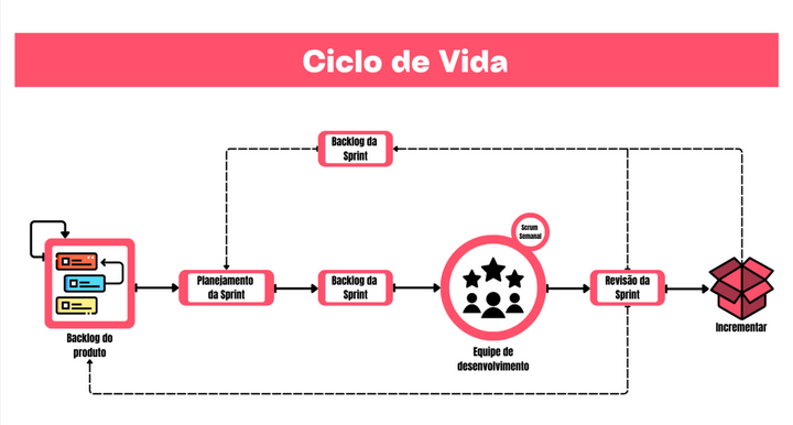 A imagem do ciclo de vida acima, demonstra um fluxo Scrum modificado com: Backlog do produto → Planejamento da Sprint → Backlog da Sprint → Equipe de Desenvolvimento (com Scrum semanal) → Revisão da Sprint → Incremento, com um retorno ao Backlog do produto para refinamento.